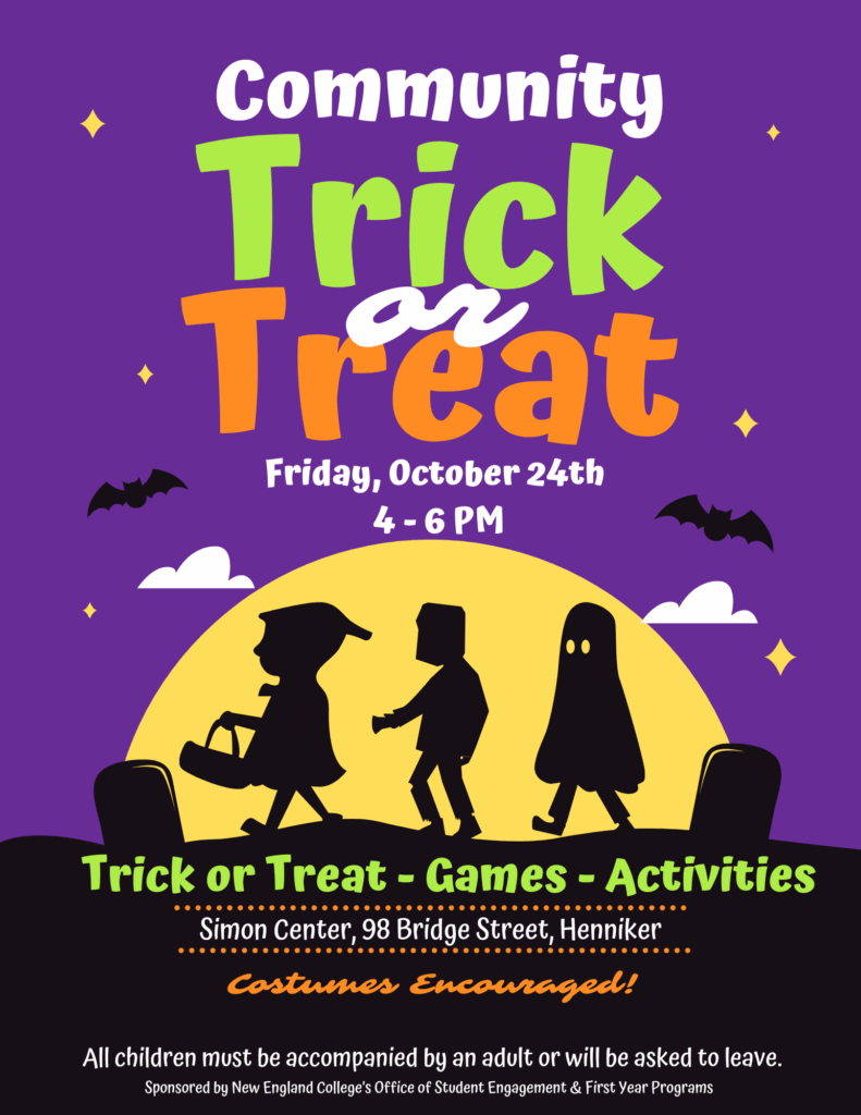 The community is invited to attend NEC’s Trick or Treat event. Guests will enjoy trick-or-treating, games, and activities. Costumes are encouraged!